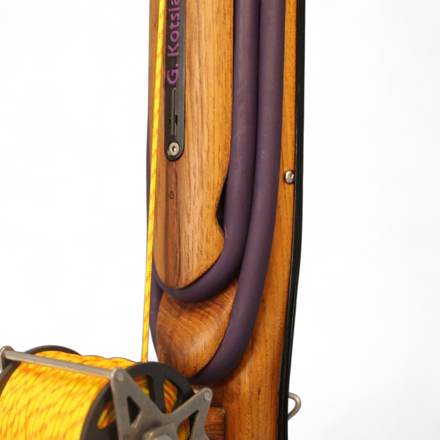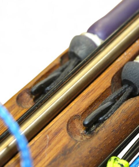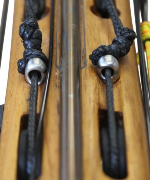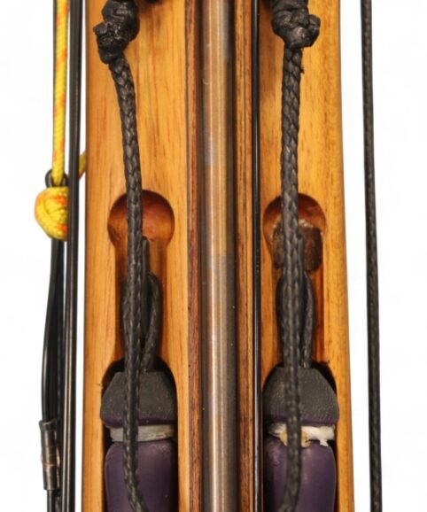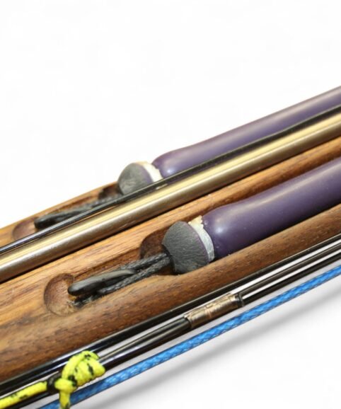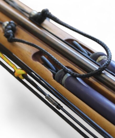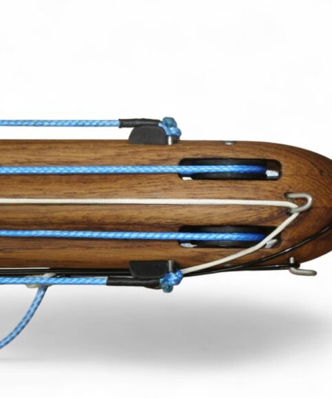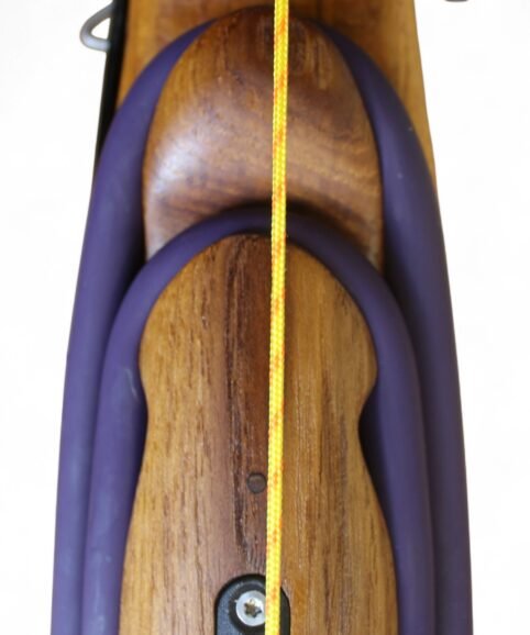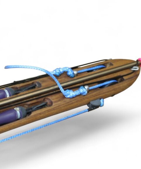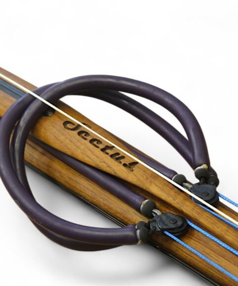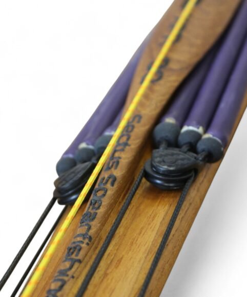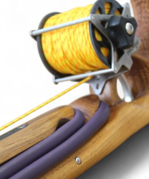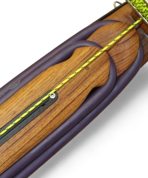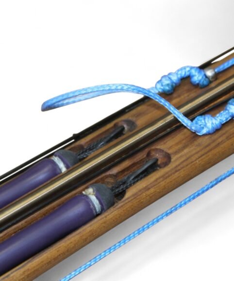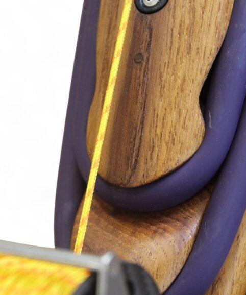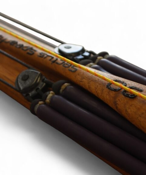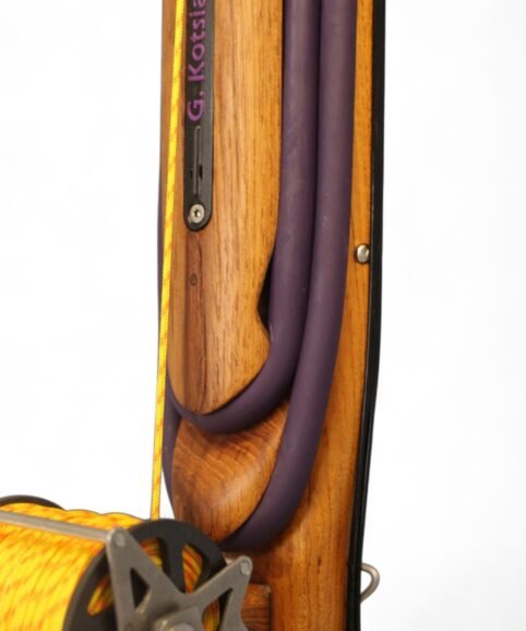 The auxiliary 14.5 mm bands are set in a continuous loop, without wishbones, and are anchored as far back as possible in specially shaped positions on the wooden body, close to the reel. This ensures that their entire length remains active, significantly increasing the effective stretch compared to conventional setups.