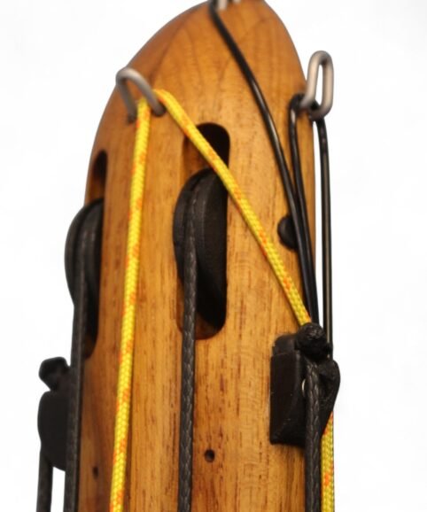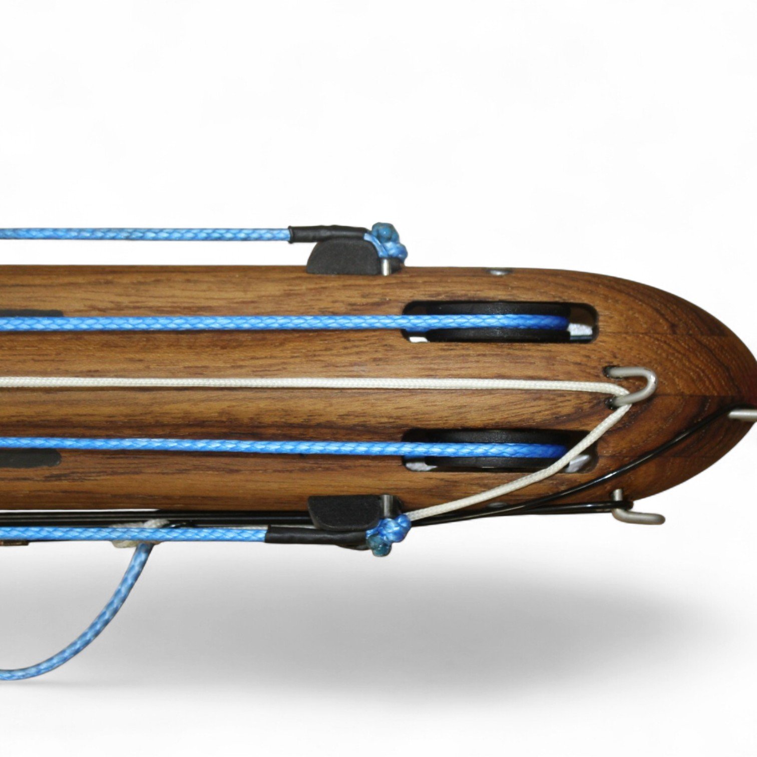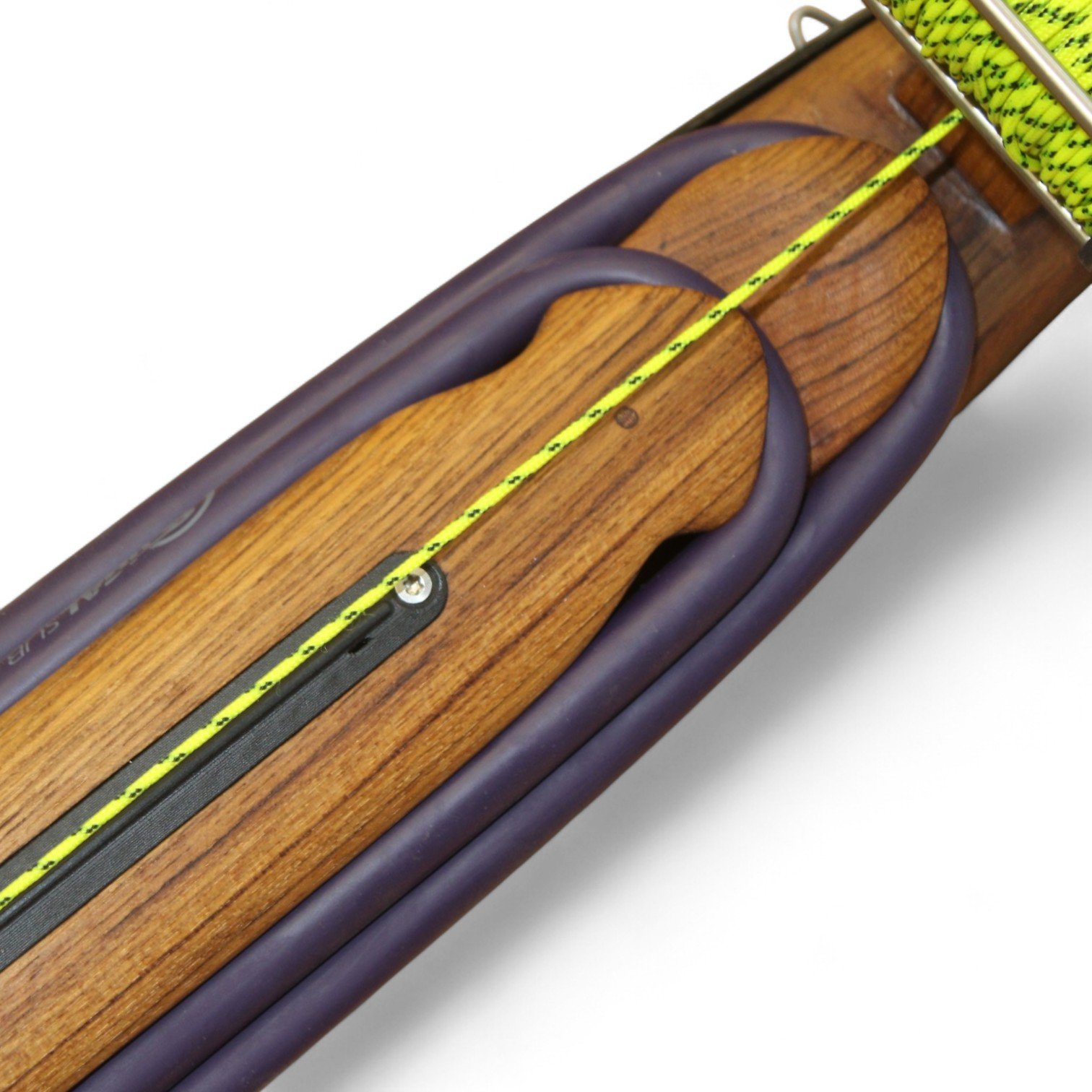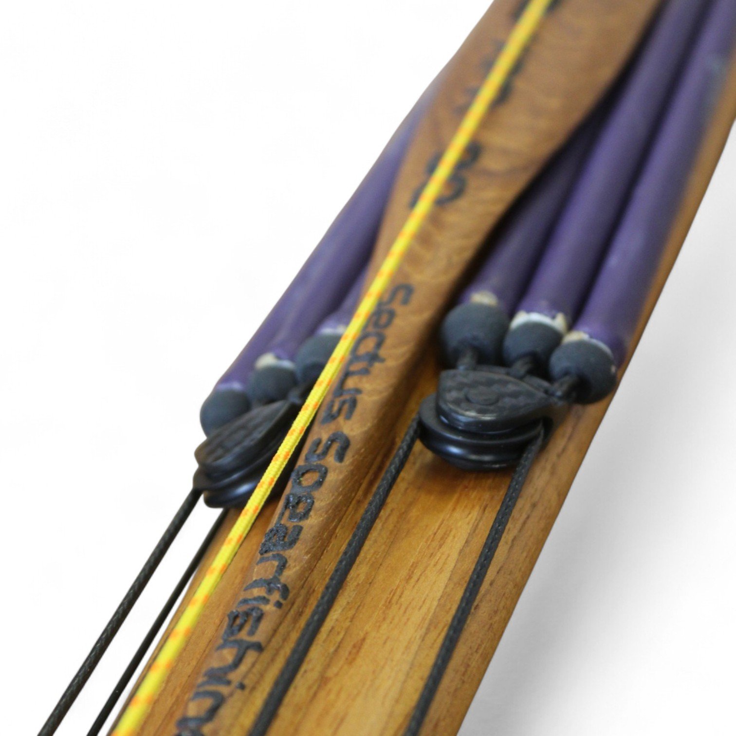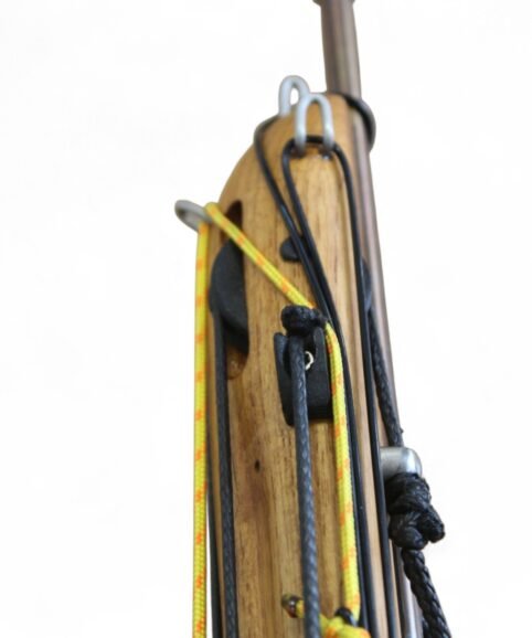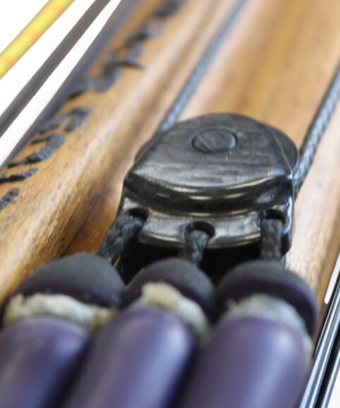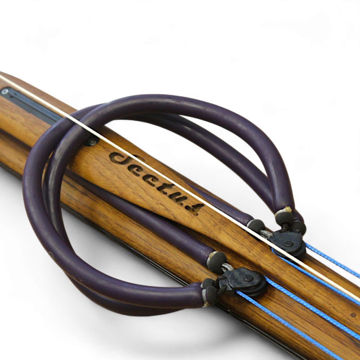 The auxiliary 14.5 mm bands are set in a continuous loop, without wishbones, and are anchored as far back as possible in specially shaped positions on the wooden body, close to the reel. This ensures that their entire length remains active, significantly increasing the effective stretch compared to conventional setups.