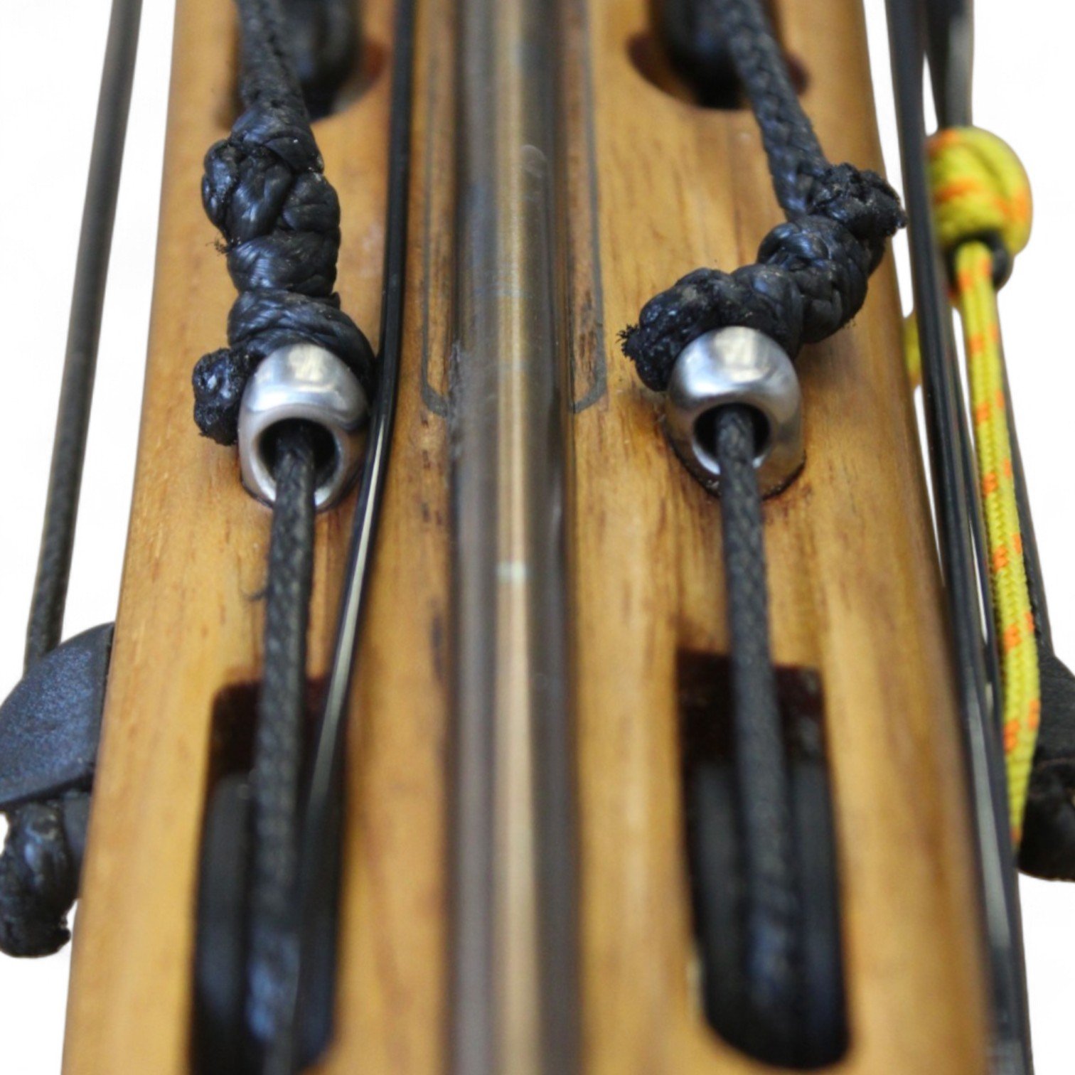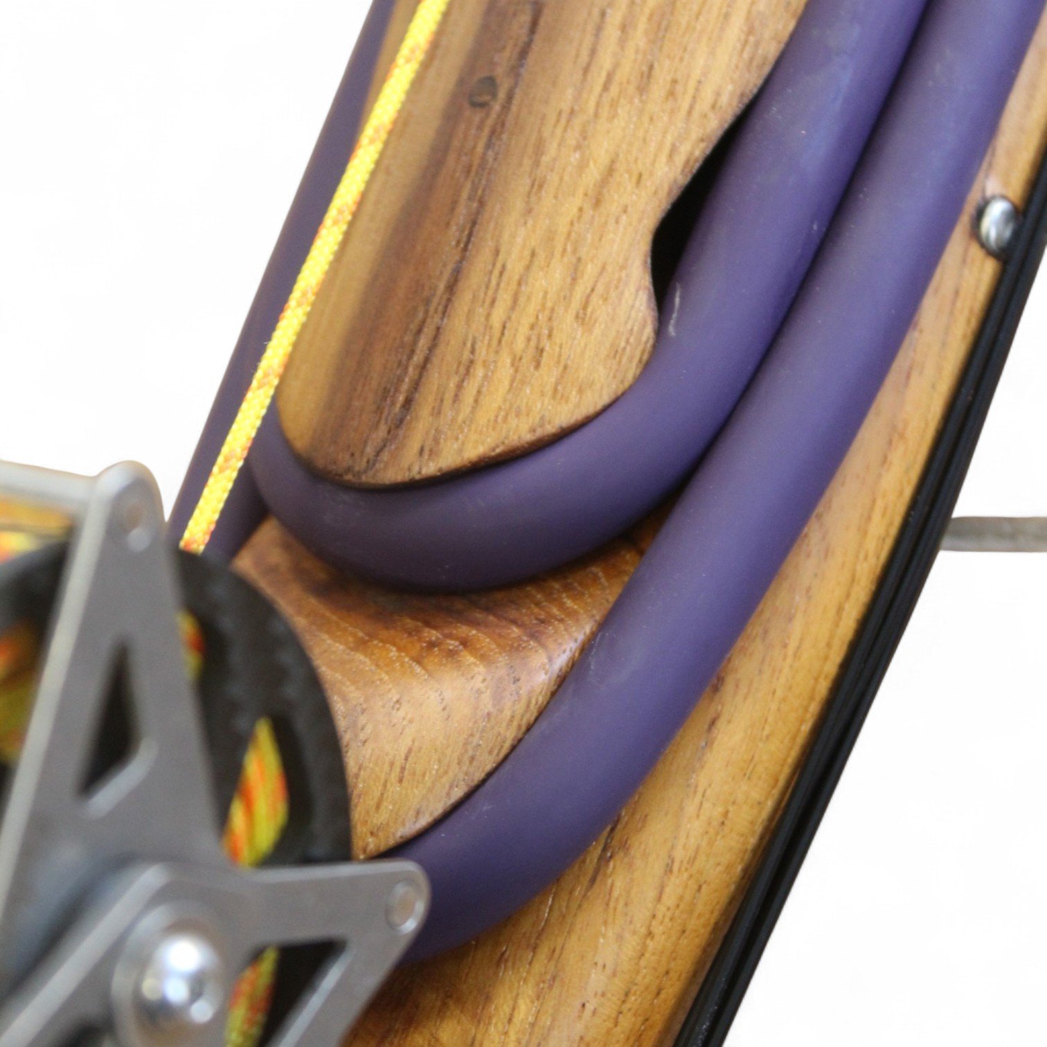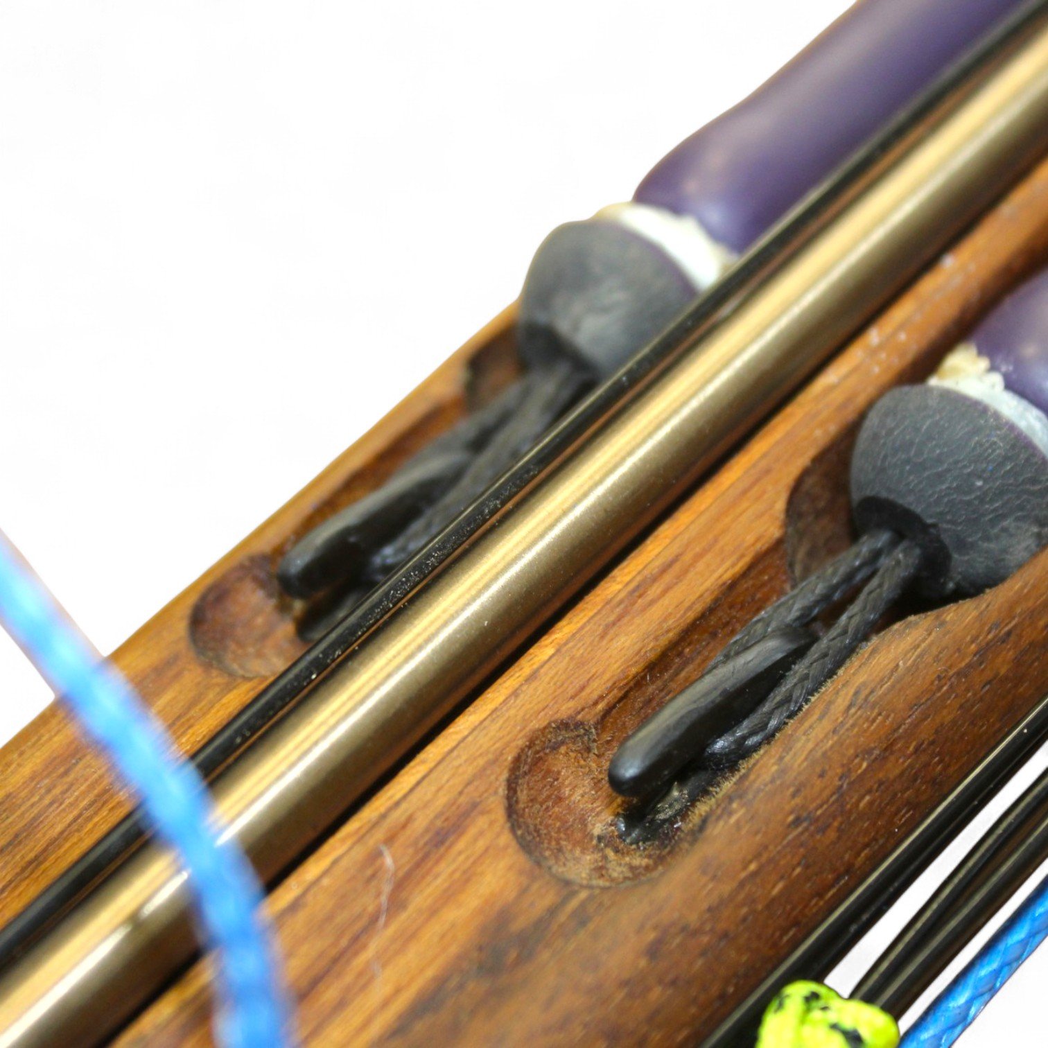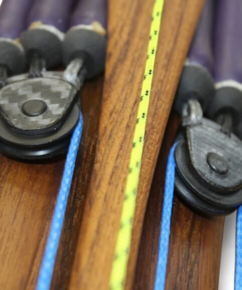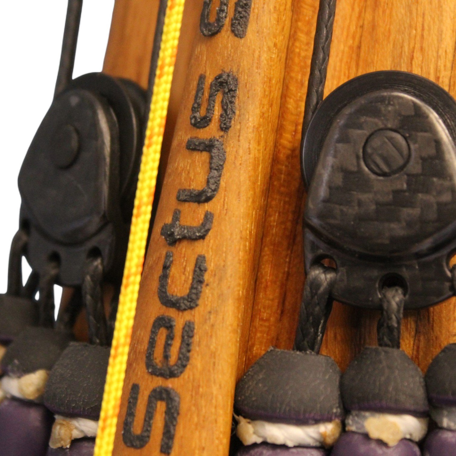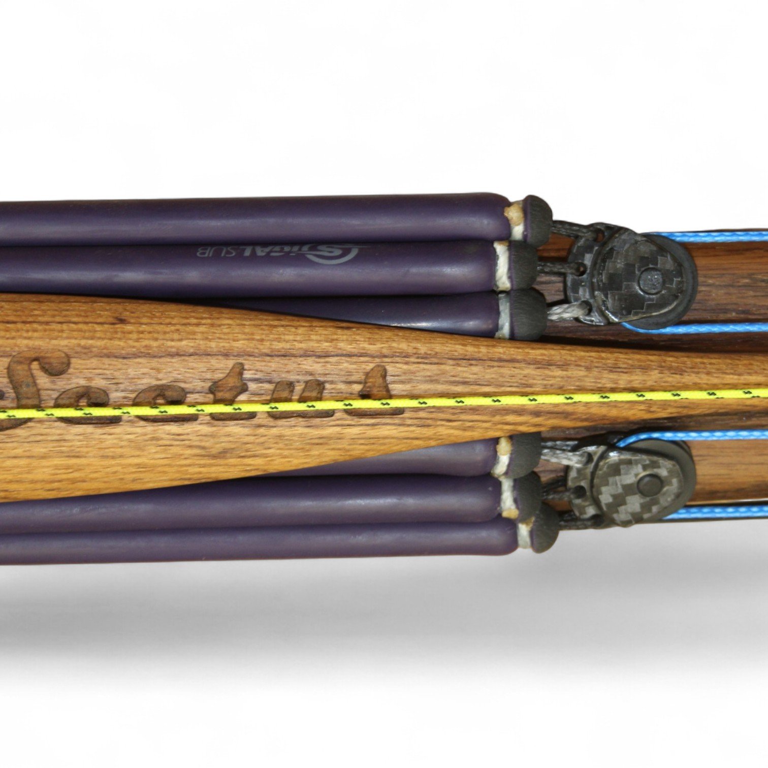 The auxiliary 14.5 mm bands are set in a continuous loop, without wishbones, and are anchored as far back as possible in specially shaped positions on the wooden body, close to the reel. This ensures that their entire length remains active, significantly increasing the effective stretch compared to conventional setups.