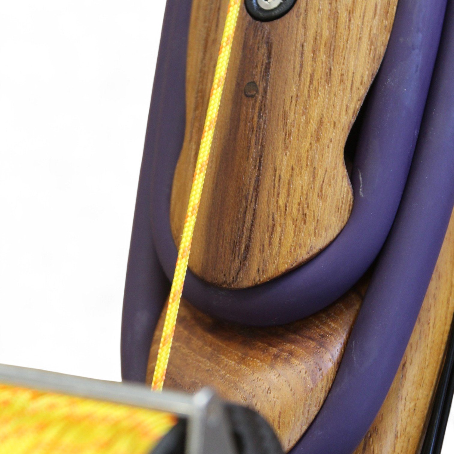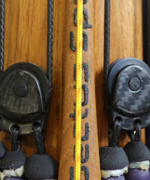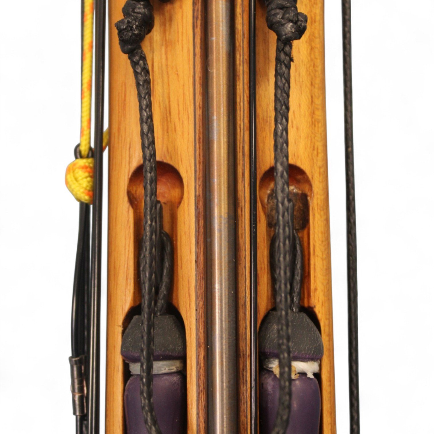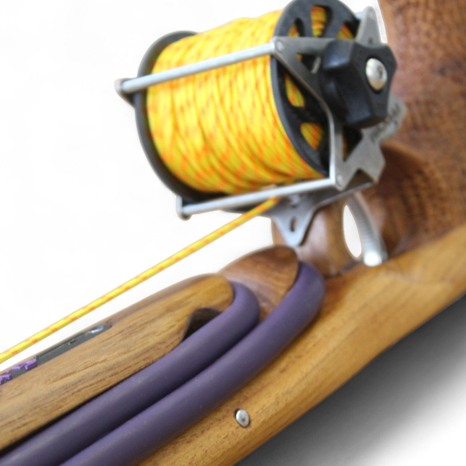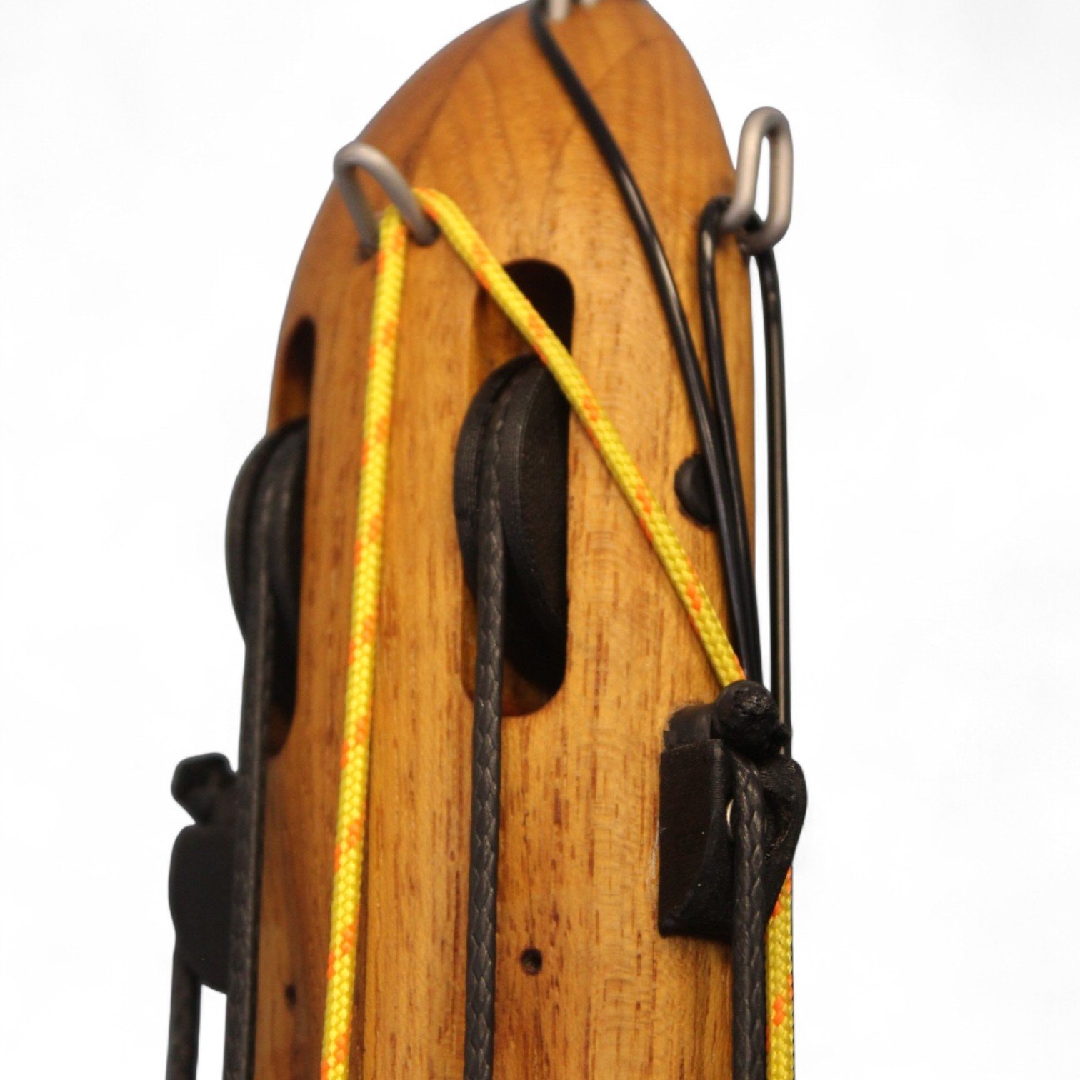The auxiliary 14.5 mm bands are set in a continuous loop, without wishbones, and are anchored as far back as possible in specially shaped positions on the wooden body, close to the reel. This ensures that their entire length remains active, significantly increasing the effective stretch compared to conventional setups.