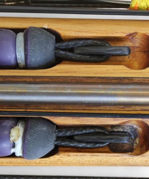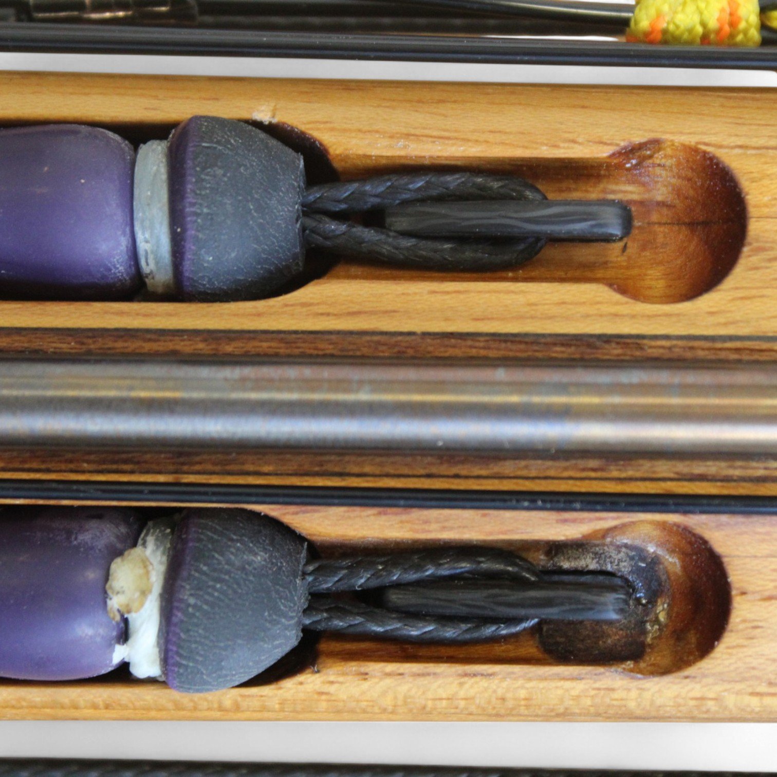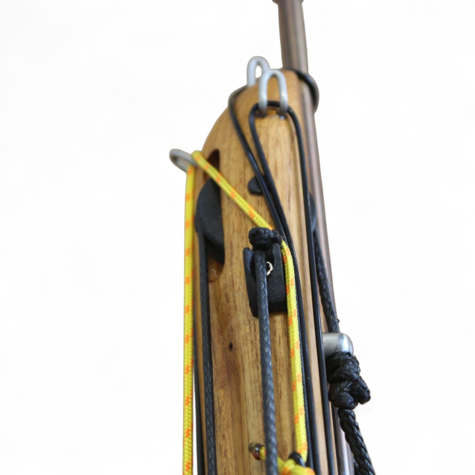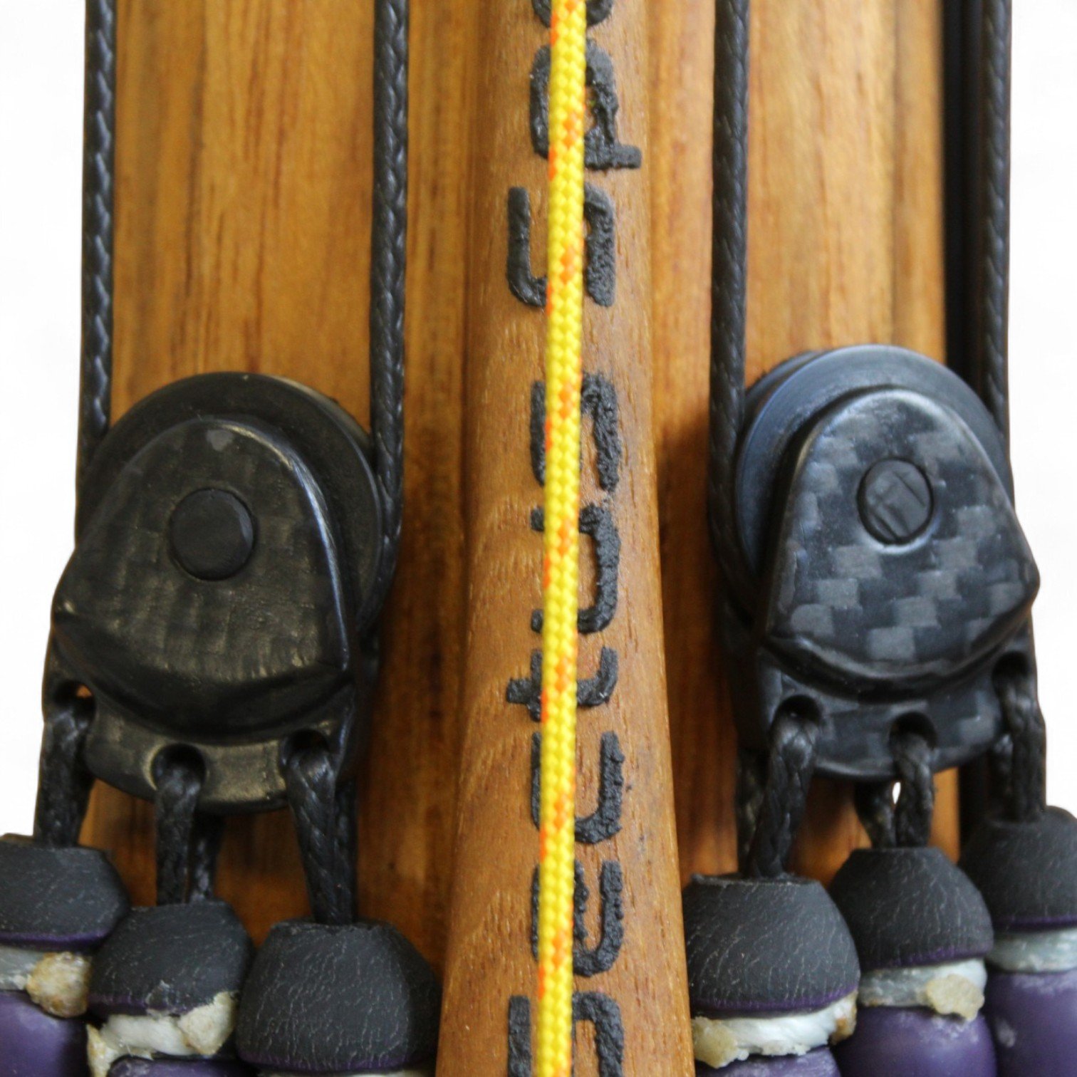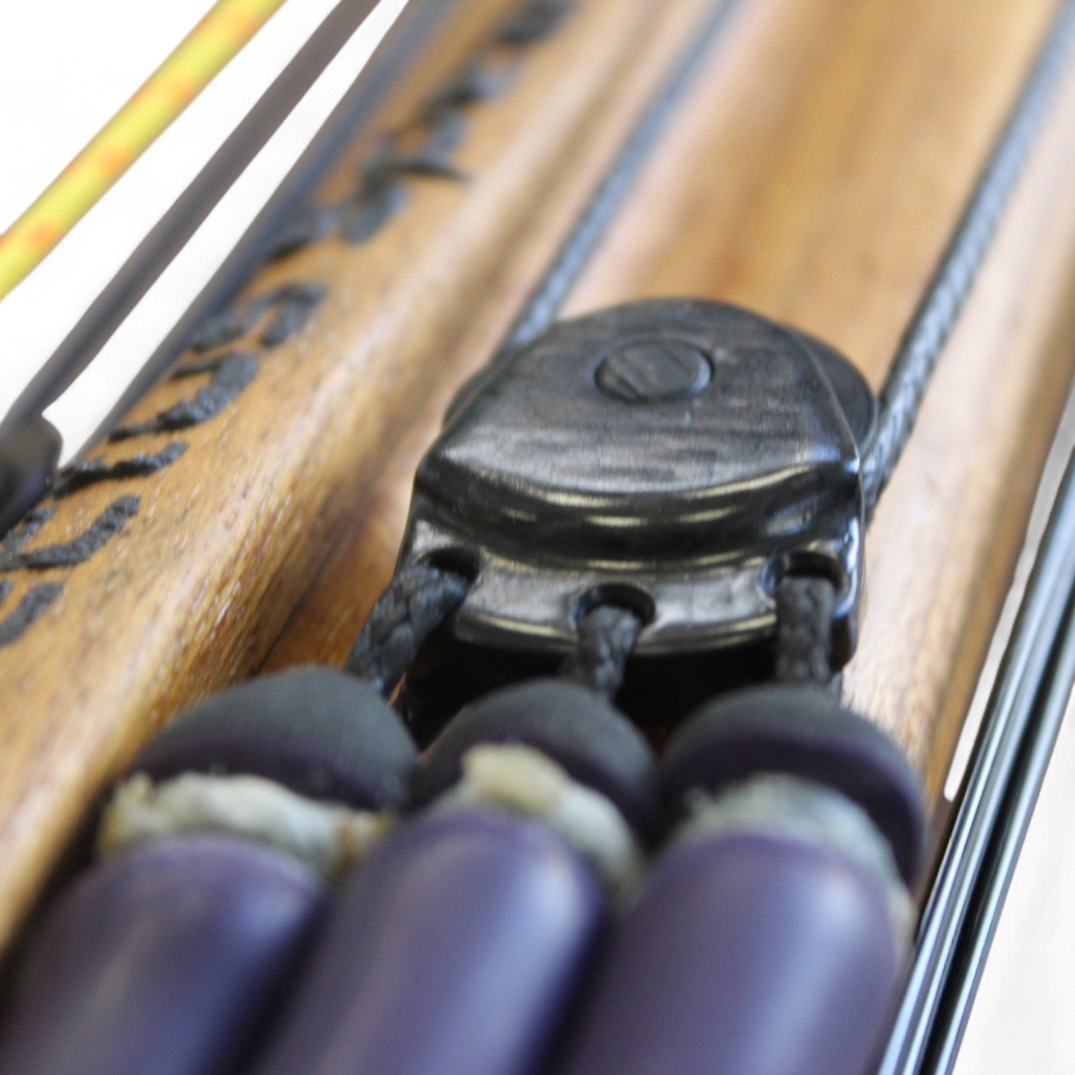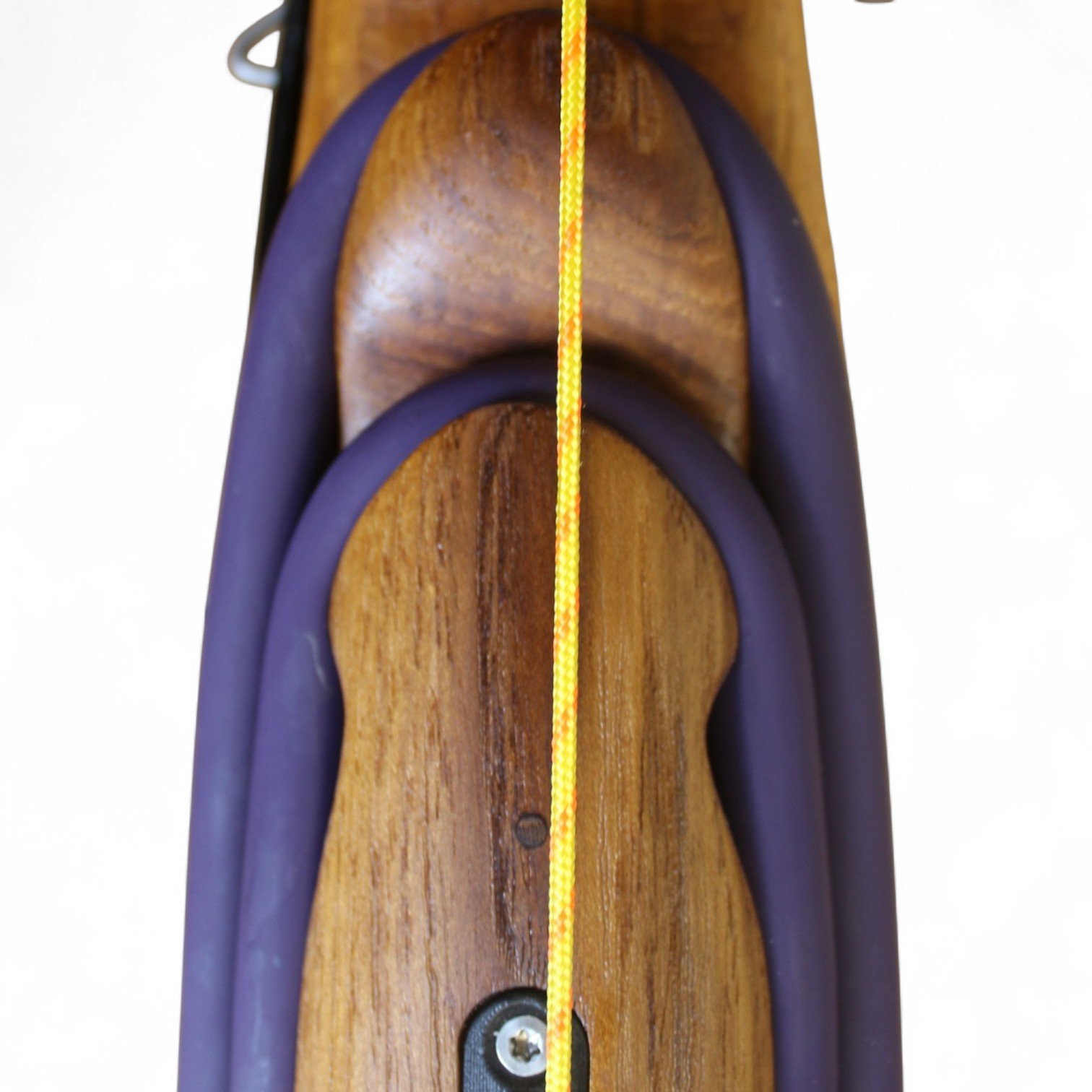 The auxiliary 14.5 mm bands are set in a continuous loop, without wishbones, and are anchored as far back as possible in specially shaped positions on the wooden body, close to the reel. This ensures that their entire length remains active, significantly increasing the effective stretch compared to conventional setups.